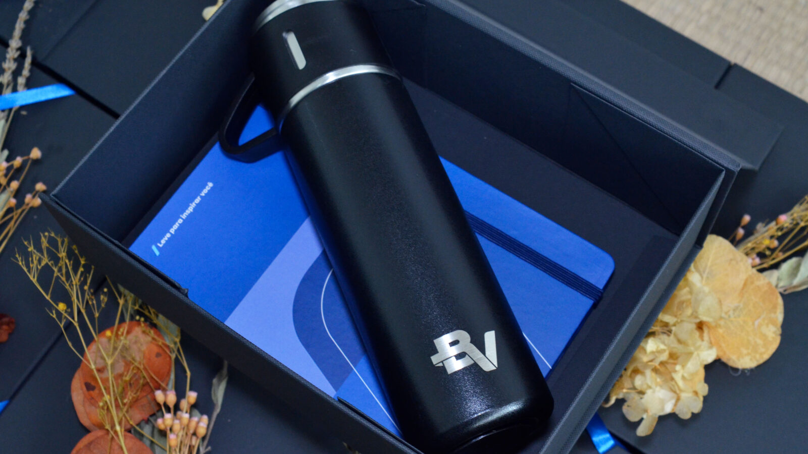 Kit com garrafa e caderno para um super encontro de todas as secretárias do Grupo Votorantim, com o intuito de promover o networking e ampliar as parcerias entre as diferentes empresas do grupo.