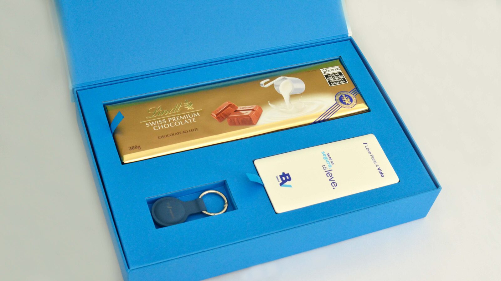 Kit composto por: Power Bank 10.000 mAh, Smart Tag Xaiomi e barra de chocolate lindt.
